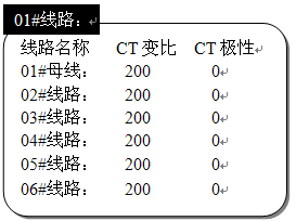 本菜單設置線路的CT變比及極性。按左右鍵翻頁,按上下方向鍵移動光標選擇需修改的參數項。按確認鍵進入修改狀態,此時按方向鍵修改參數,按確認鍵修改下一個參數。修改后按“確認"鍵保存,按“取消"鍵不做保存。
